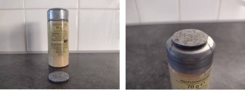 4. Een smal (kruiden)strooibusje van plastic + stoelpootviltje